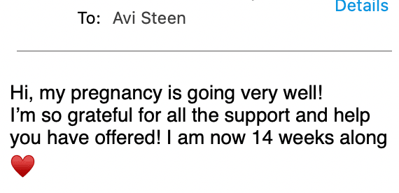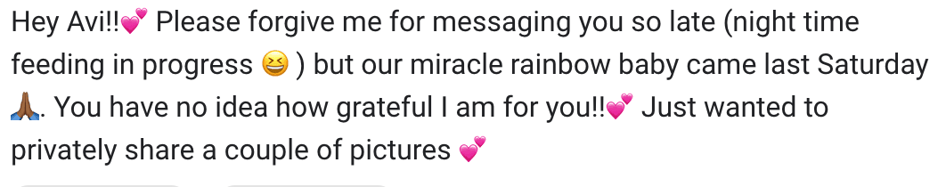 “Avi! I can’t tell you how much you blessed us during our period of trying to conceive. My husband and I downloaded your 2 Week Wait devotional and read it together every night. You are a part of this testimony! Thank you! “-S.